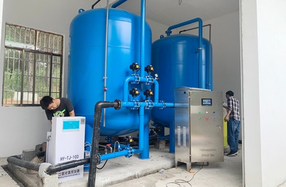 工藝流程:山泉水-絮凝投加器-石英砂過(guò)濾器-二氧化氯加藥器-用水點(diǎn)